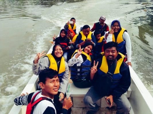 Setelah memakai jaket pelampung, kami langsung menaiki perahu boat. Ada 12 orang dan satu orang supir perahu. Kapal melaju pelan, sepertinya supir perahu ingin kami menikmati suasana Kali Bekasi yang berwarna hijau pekat.