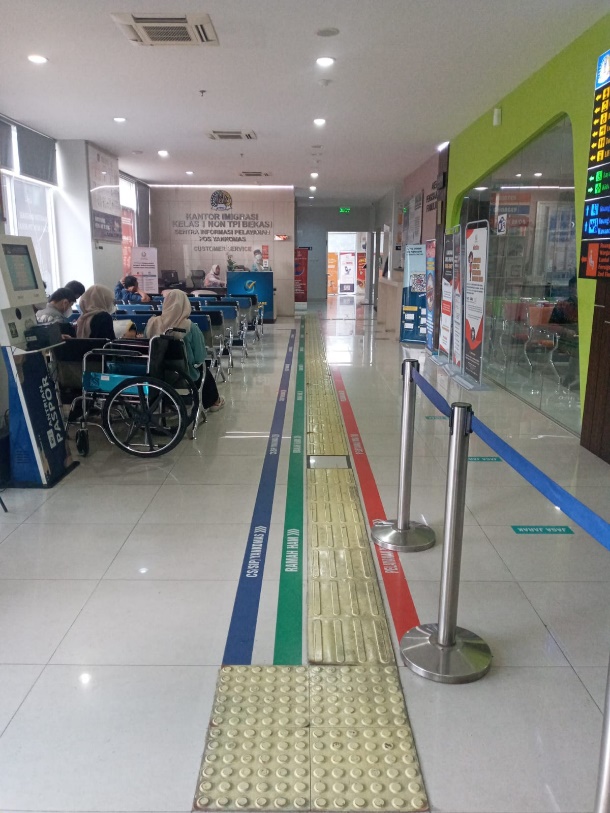 “rambu-rambu petunjuk arah menuju ruang layanan ramah ham memang kami siapkan bagi pemohon prioritas terutama bagi pemohon penyandang disabilitas agar dapat mudah menuju ruang layanan dan mendapatkan pelayanan secara baik sesuai haknya” ungkap Kepala Kantor Imigrasi Kelas I Non TPI Bekasi, Wahyu Hidayat.